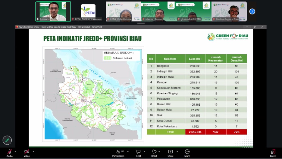 Proses pemutakhiran data ini mencakup identifikasi berlapis, mulai dari tutupan lahan (1990-2024), Kesatuan Hidrologis Gambut (KHG), hingga potensi area Perhutanan Sosial (PS) dan kawasan konservasi. Tercatat, dari sekitar 4,98 juta hektare luas KHG di Riau, lebih dari 1,78 juta hektare di antaranya masuk ke dalam area indikatif JREDD+. Selain itu, program ini juga mengakomodir 97.815 hektare areal PS untuk memastikan masyarakat lokal menjadi aktor utama dalam tata kelola hutan.