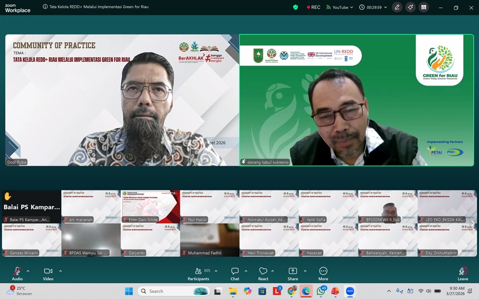 Dalam rangka berbagi pengetahuan dan praktik melalui Inisiatif tersebut, Balai Pendidikan dan Latihan Sumber Daya Manusia (BDLSDM) Kementerian Kehutanan menyelenggarakan diskusi daring bertema “Tata Kelola REDD+ Riau Melalui Implementasi GREEN for Riau Initiative” pada Jumat, 27 Maret 2026. Kegiatan ini mendatangkan narasumber Danang K. S. dari Koordinator Provinsi Program REDD+ Riau melalui fasilitasi UN REDD Programme (UNEP dan FAO) yang berlangsung pukul 08.00–10.00 WIB melalui platform Zoom Meeting ini yang secara resmi dibuka oleh Kepala Pusat Pendidikan dan Pelatihan Kementerian Kehutanan. Diskusi ini bertujuan untuk meningkatkan pemahaman peserta mengenai konsep dan penerapan tata kelola REDD+ di Riau, berbagi pengalaman dan praktik terbaik (best practice), serta mendorong kolaborasi lintas pihak dalam implementasi inisiatif strategis tersebut.